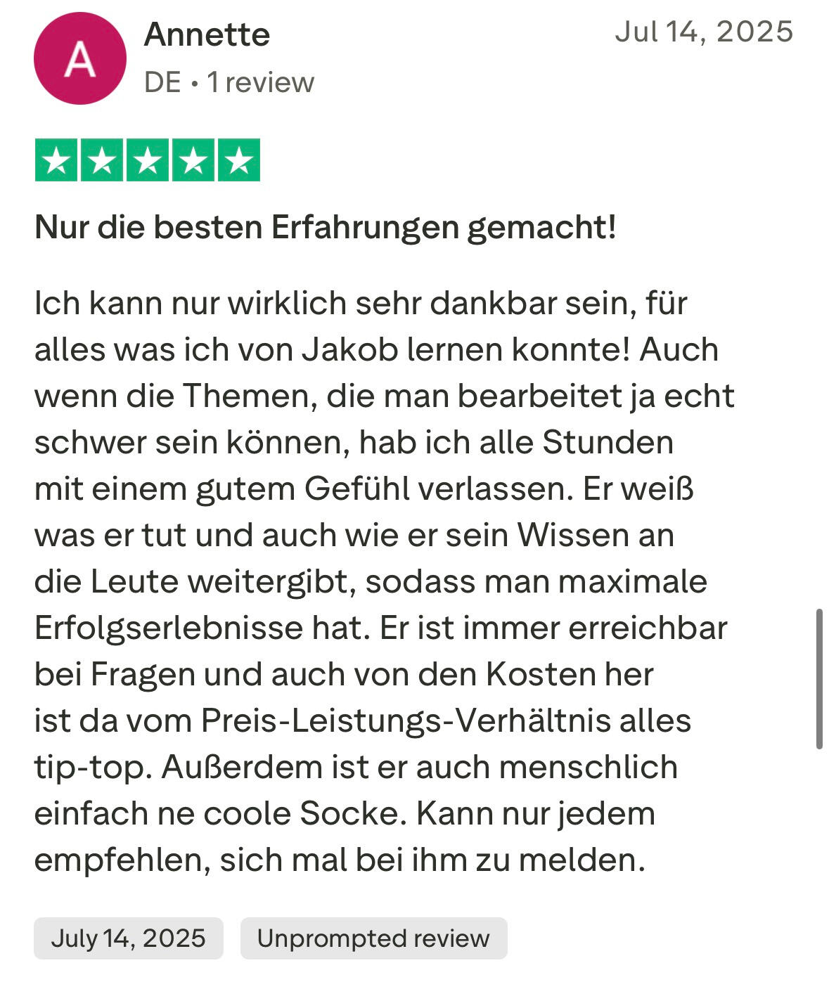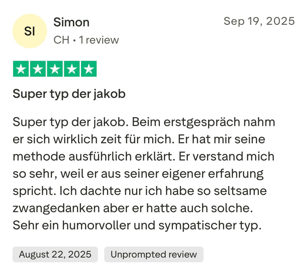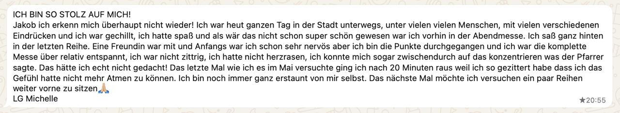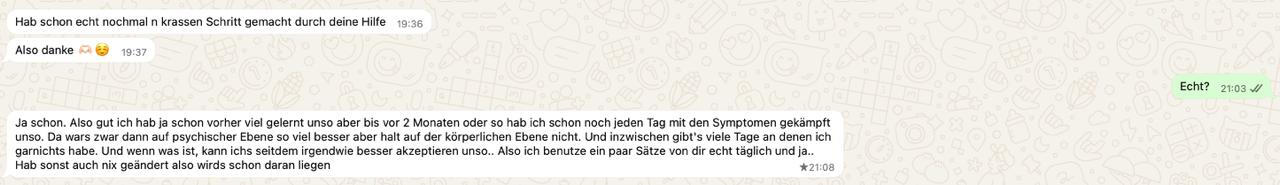 Hyperfokus kommt auf das Symptom (das können wir nicht verhindern, weil du Angst davor hast). Und jetzt versuchst du den Hyperfokus als ganz natürliches Phänomen zu betrachten: "Ah, der Hyperfokus ist wieder da. Er nervt mich, aber was solls." - und jetzt versuchst du dich wieder dem Alltag zu widmen. Nicht auf Krampf den Hyperfokus wegdrücken versuchen. Sondern so gechillt wie möglich sich wieder auf den Alltag fokussieren, ohne aus dem Hyperfokus ein Problem zu machen.Und ja, der Hyperfokus kann nach 5 Sekunden wieder am Symptom sein und ja, er kann uns richtig nerven. Aber auch das sehen wir nicht als Problem, sondern gehen genau gleich vor.Solange wir Angst vor dem Symptom haben, wird der Hyperfokus immer wieder kommen. Aber so können wir zumindest optimal reagieren, um das Nervensystem nicht noch weiter anzuheizen.Um den Hyperfokus nachhaltig zu bewältigen, müssen wir die Angst vor den körperlichen Symptomen verlieren.Und ich weiss - jetzt denkst du dir: "Naja, einfacher gesagt als getan!".Und das stimmt auch. Angstbewältigung ist ein Prozess über mehrere Wochen und Monate und ist alles andere als ein Spaziergang durch den Park. Jeder der etwas anderes verspricht, verkauft eine Hoffnung, keine Lösung.Aber ich denke der Weg lohnt sich, denn Ängste schränken das Leben oft sehr ein und man kann Dinge kaum noch genießen. Denn selbst wenn man einen 5000€ Urlaub geschenkt bekommen würde, hätte man meistens nicht viel davon, wenn die Ängste die ganze Zeit reinkicken.Darum will ich dich ermutigen dranzubleiben. Und du hast wahrscheinlich schon viel probiert und denkst vielleicht, dass du ein hoffnungsloser Fall bist und nur du diese Ängste hast. Aber nach über unzähligen Gesprächen mit über 200 Betroffenen weiß ich, dass Ängste sehr unterschiedlich sein können, aber im Endeffekt immer die gleichen Ursachen dahinter stecken.